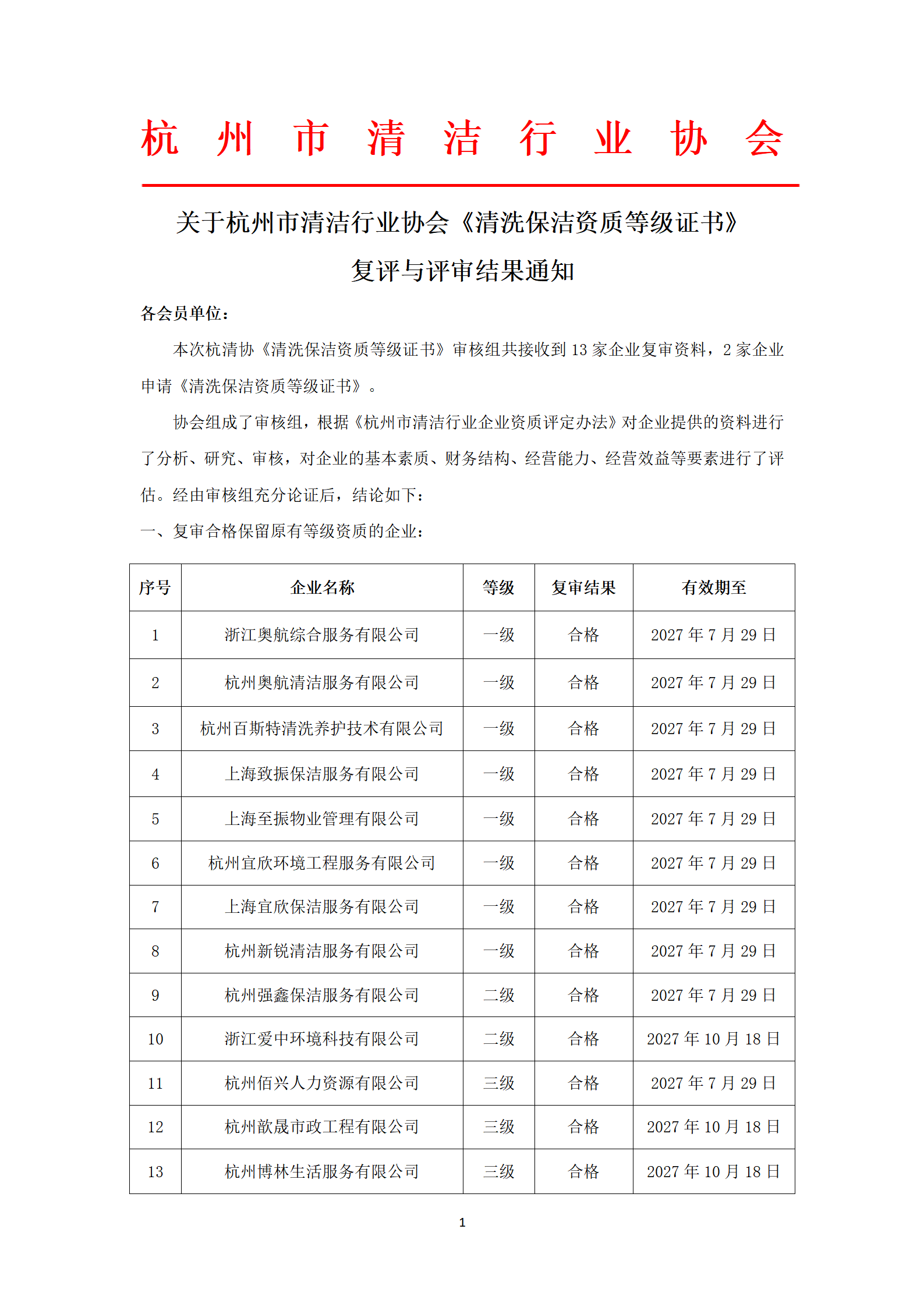 关于杭州市清洁行业协会《清洗保洁资质等级证书》 复评与评审结果通知