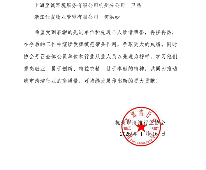关于表彰2025年度杭州市清洁行业协会先进单位和先进个人的决定