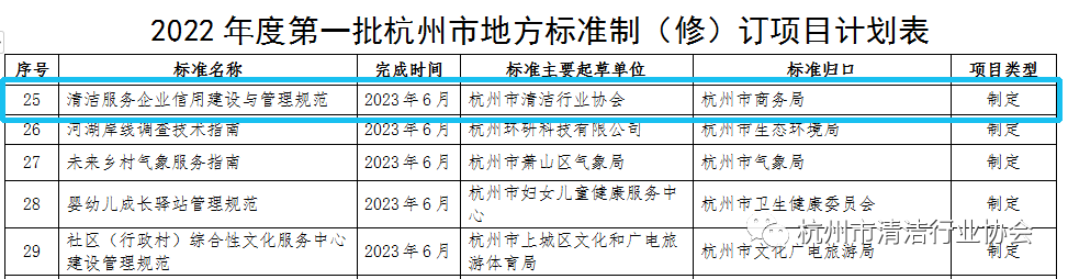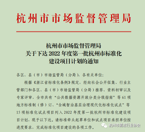 近日,杭州市市场监督管理局下发了《关于下达 2022 年度第一批杭州市标准化 建设项目计划的通知》经向社会公开征集、资料初审、专家审核,杭州市清洁行业协会申报的“清洁服务企业信用建设与管理规范”被列入2022年度第一批杭州市地方标准制订项目计划。