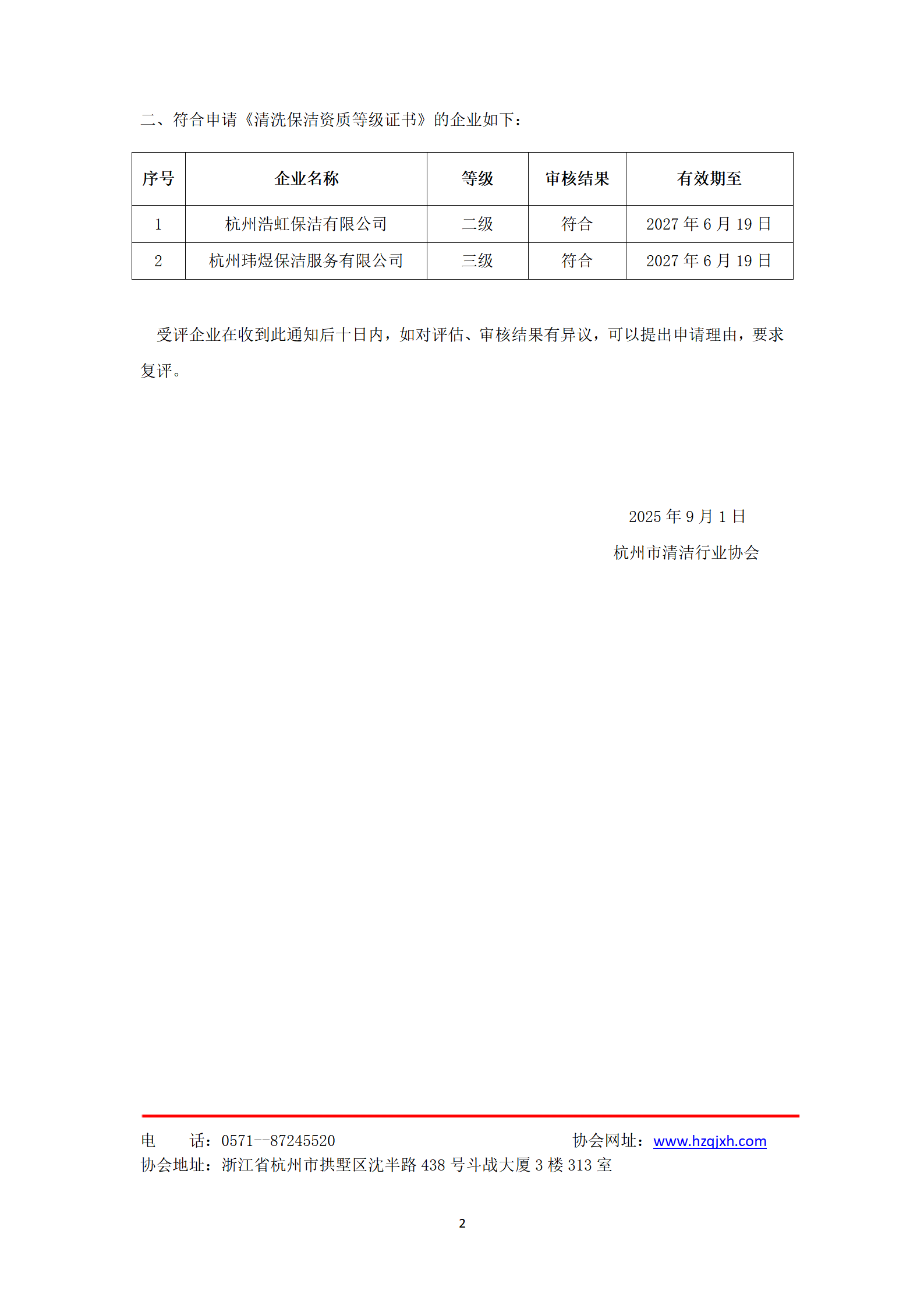 关于杭州市清洁行业协会《清洗保洁资质等级证书》 复评与评审结果通知
